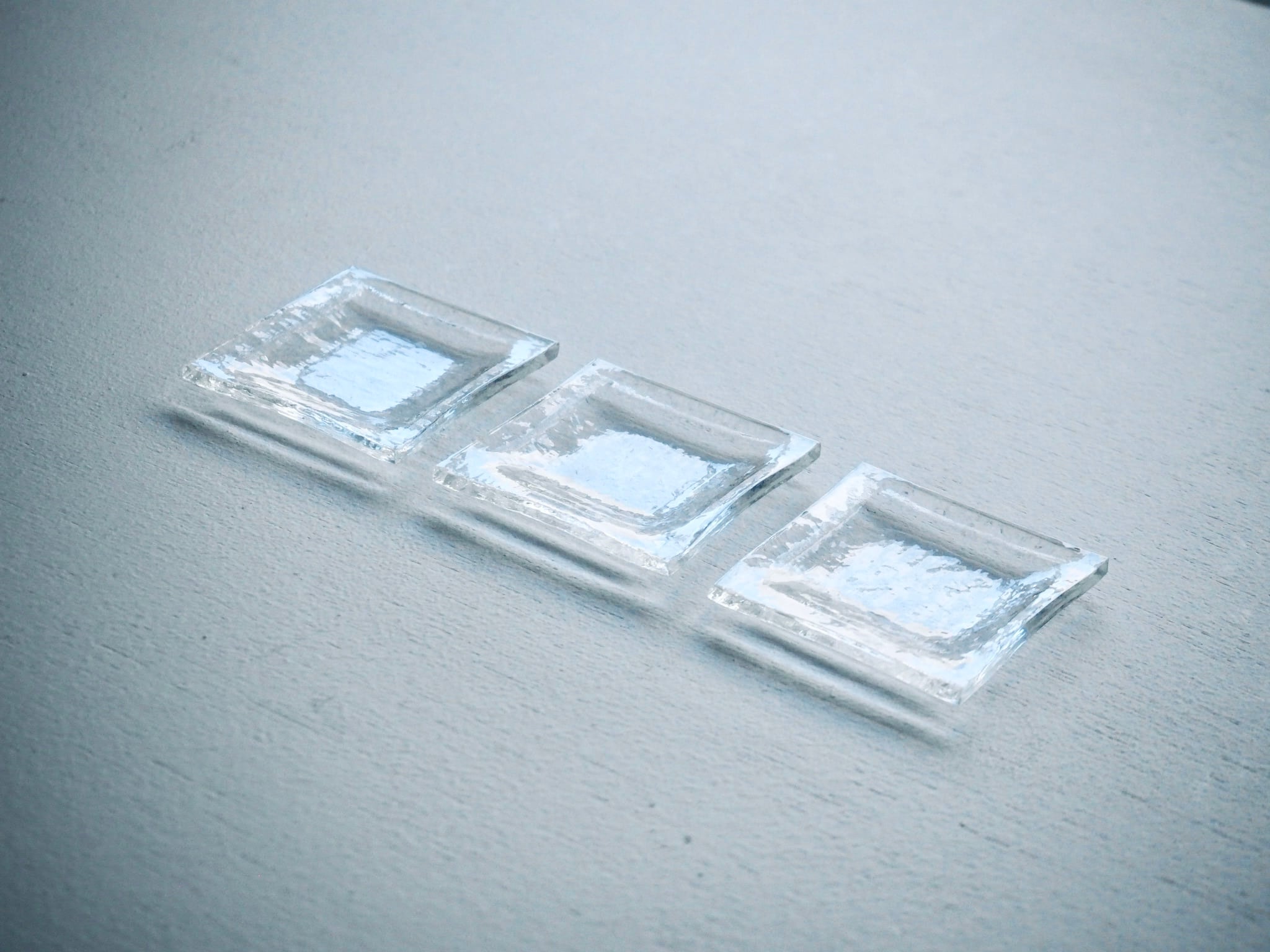 50mm×50mmの豆皿サイズですので、食卓やサイドテーブル、ディスプレイなど、さまざまなシーンで活躍し、透明でさりげないガラスの光がささやかにのせているものを引き立ててくれます。